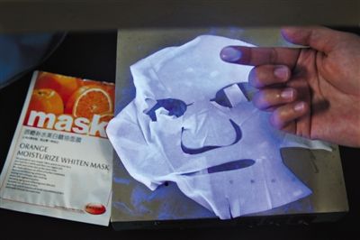 记者查看所有面膜的成分标注,均未提及添加荧光增白剂。然而,北京服装学院材料科学与工程学院实验室对这8种面膜测试的结果显示,有2种面膜含有较多荧 光剂。其中包括1种在京客隆甜水园店销售的“美主人”香橙补水美白精油面膜,外包装写着“让有点黄的脸,贴出雪一样的白”,并建议每天使用。