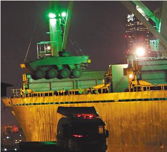 新加坡陆军的一批AV-81八轮装甲车,17日深夜在台湾高雄港新滨码头卸下船,18日凌晨陆续由拖车载运北上,供赴台演训的新加坡部队使用。