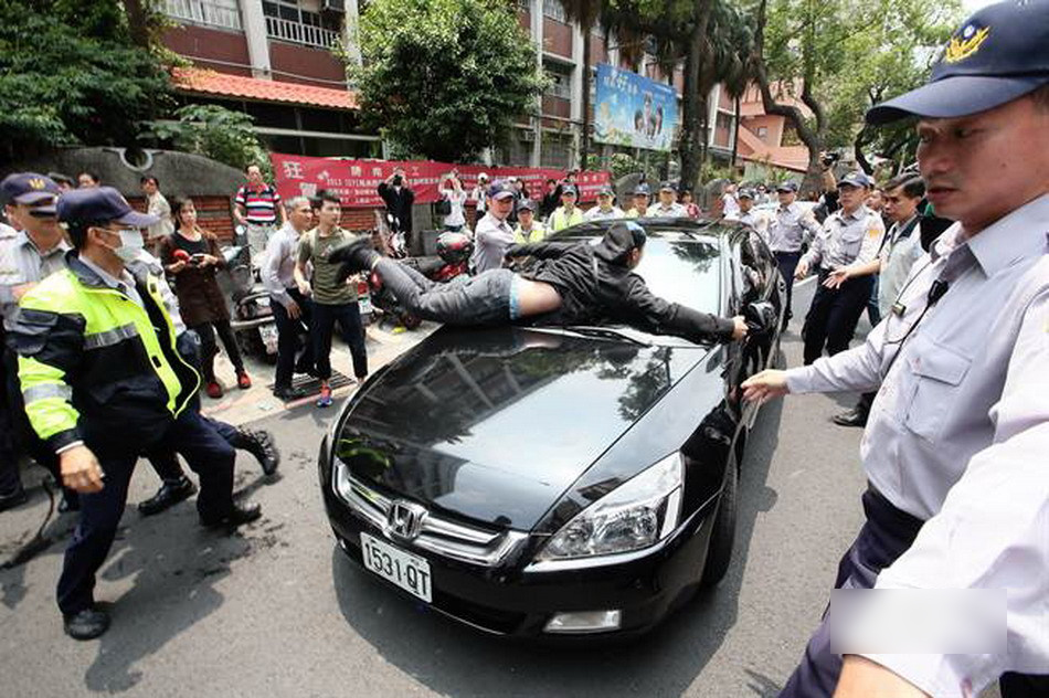 4月29日,台湾“反核”民众在台“立法院”外试图包围“立委”座车,爆发严重肢体冲突,多位民众试图拦住座车,甚至爬上引擎盖。供图:台湾《中时电子报》