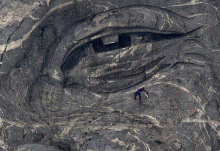 4月20日,,山东临沂,沂蒙山龟蒙景区寿星山体雕刻,应聘上岗的“女蜘蛛侠”清洁雕刻时晕倒。