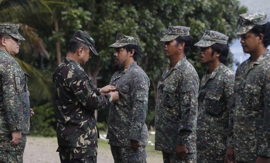 2014年3月29日,菲律宾派渔船向非法坐沉于我国南沙仁爱礁的登陆舰送去补给。同时,菲律宾邀请的媒体也随船登上坐沉战舰进行了拍摄,包括舰上驻防人员的卧室、厨房、会议室、等内舱照。图为换防下来的军人在回到本土后受到军方嘉奖并颁发了勋章。