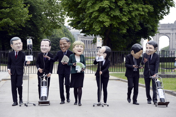 当地时间2014年6月3日,比利时布鲁塞尔,牛津饥荒救济委员会的示威者们戴着G7峰会领导人的面具,分别扮成美国总统奥巴马、英国首相卡梅伦、德国总理默克尔、法国总统奥朗德、日本首相安倍晋三、意大利总理伦齐以及加拿大总理哈珀的模样,恶搞他们患病“戴氧气罩”和“吊盐水”的模样,并在欧盟总部附近抗议,呼吁各国领导人关注世界能源安全。
