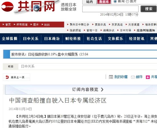 日本共同社2月24日报道,据日本第10管区海上保安总部(位于鹿儿岛市)称,23日正午许,海上保安厅飞机在鹿儿岛县奄美大岛以西约335公里的日本专属经济区(EEZ)内发现中国海洋调查船“滨海512”未经事先通报擅自航行。