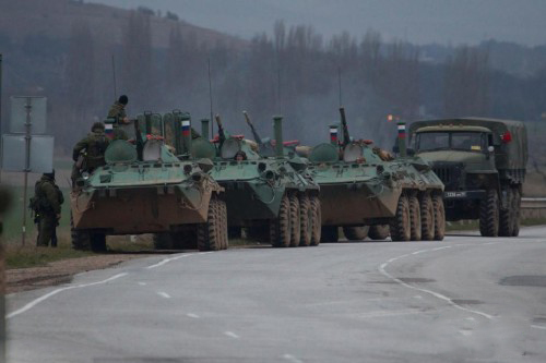 俄军装甲部队进入克里米亚首府附近