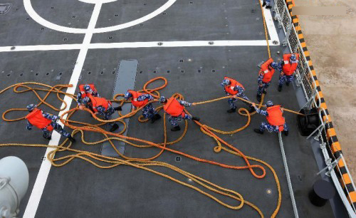 5月22日,直升机试车后地勤人员对直升机进行维护。当日,中俄“海上联合—2014”军事演习的参演军舰驶离上海某军港,驶往演习海区。航行途中,导弹驱逐舰郑州舰上的舰载直升机进行了飞行前预先机务准备。