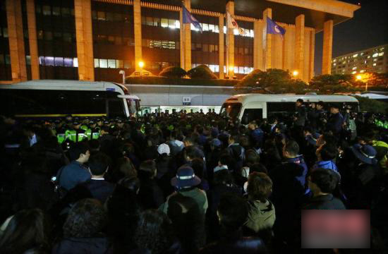 资料图:当地时间2014年5月9日凌晨,“岁月号”沉船事故遇难者遗属欲前往总统府青瓦台同朴槿惠总统会面,但在青瓦台附近遭到警方阻拦,双方通宵对峙。