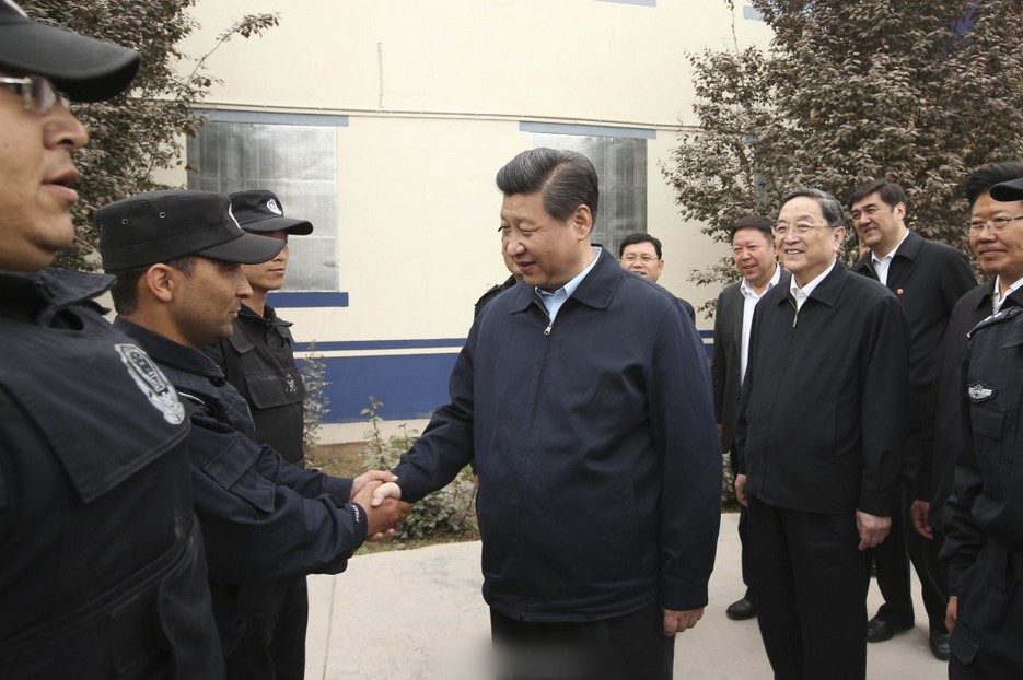 2014年4月27日,新疆喀什,习近平到喀什市公安局乃则尔巴格派出所与民警合影。