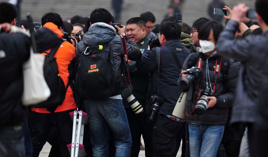 2014年3月3日,北京,十二届全国政协二次会议在人民大会堂开幕。记者围堵采访毛新宇。