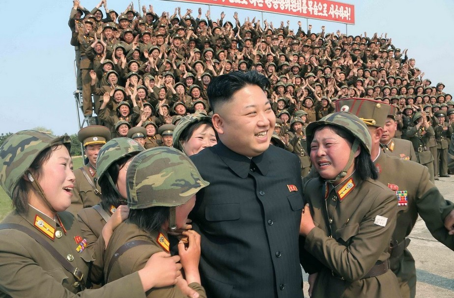 2014年4月24日消息,据朝鲜《劳动新闻》4月24日报道,朝鲜最高领导人金正恩指导了朝鲜人民军第851部队所属女子火箭炮部队的炮击训练。图为金正恩早女兵簇拥,女兵激动落泪。