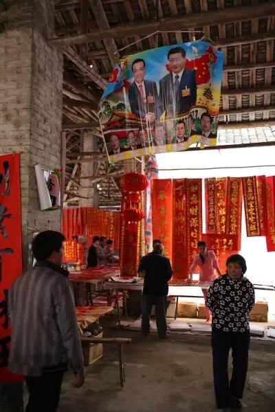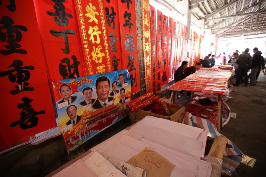 2月17日,广西玉林,兴业县城隍镇,民众在选购年画。当地多个年画摊主介绍,习近平画像已经成为仅次于毛泽东画像的畅销年画 2月17日,广西玉林,兴业县城隍镇,民众在选购年画。
