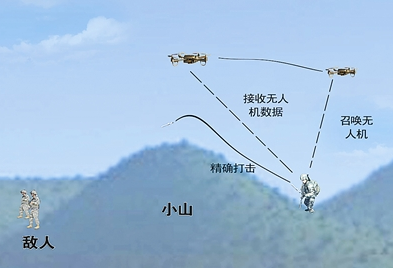 战斗中,一座小山背后可能正潜伏着敌人,但光学、激光、红外等侦察器材均无法准确判定。这时,指挥员鼓捣起了手中的步枪。很快,一架微型无人机飞临山顶,并将观察到的山后态势传输至指挥员步枪上的显示屏。随后,一场精确火力打击悄然发起……