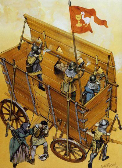 总得来说,中世纪的骑兵是以大型编队来部署作战的,他们缺少战术训练或者战术配合技巧,最富有想象力的指挥官也别无选择,他只能把他的军队当作大棒挥舞。这是由于贵族习惯性的傲慢自大和自我意识双重因素在作祟,而这些贵族在骑兵队伍里占了相当大的比例,骑兵战术死板僵化已是再所避免。反过来,我们再看看抵御骑士进攻的“胡斯战车之盾”。虽然中世纪以骑士为核心的重装骑兵攻击战术在当时已经出现衰微的迹象,但是与条顿骑士交过手的杰士卡晓得重装骑士的厉害,而且他不能效仿瑞士长枪兵的战术,他的祖国波西米亚尽是延绵起伏的丘陵小山而非高大的山脉。不管怎样,他手下的一大群城镇居民和农民也没有受过长期的武装作战训练,这帮捷克人直接出去与德意志骑士硬碰硬无异于以卵击石,重装骑士可以轻易放倒他们这样装备简陋的反叛者。捷克贵族也帮不上什么忙,他们的数量实在是少得可怜,而且其中很多人又对起义漠不关心甚至持敌对态度。为了解决这些棘手的问题,杰士卡总结了他在东欧的作战经验,决定用战车堡垒来装备他的武装力量。