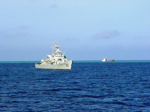 资料图:560舰在南沙巡航。远处是中国控制的礁盘。