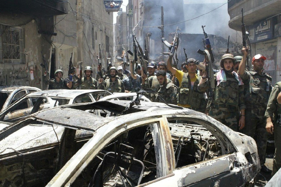 据叙利亚媒体报道,经过数日激战,叙利亚政府军再次夺回首都大马士革米丹地区的控制权。一名叙利亚安全部门官员当天早些时候告诉法新社记者,“为了在斋月开始前把恐怖分子赶出大马士革,极其激烈的冲突会在接下来48小时继续。”叙政府军士兵在大马士革街头合影