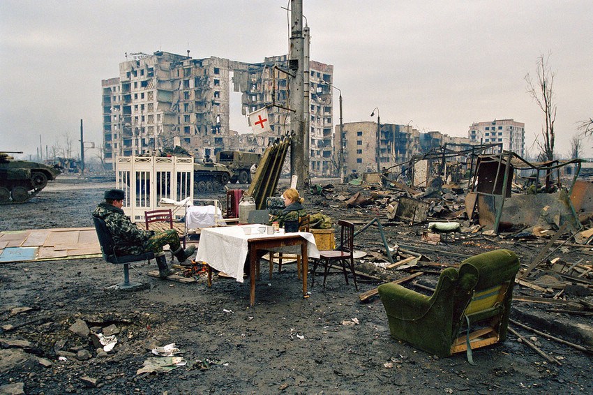 2000年4月,俄罗斯,士兵们在废墟中的临时休息处。