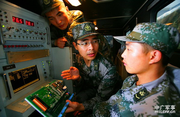 陆松利用自己的计算机专业特长,向连队战士讲解火控计算机控制电路板