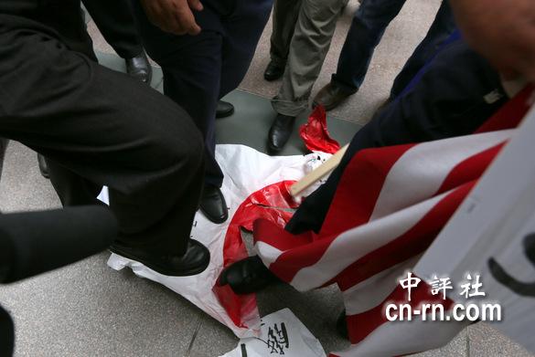 愤怒的现场抗议者践踏被撕毁的日本国旗。