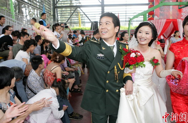 该基地体育场被火红的地毯、娇艳的玫瑰和喜庆的红灯笼装饰一新,26对新人踩着《结婚进行曲》,在战友们的祝福声中手捧鲜花,从红地毯的两端款款步入舞台。
