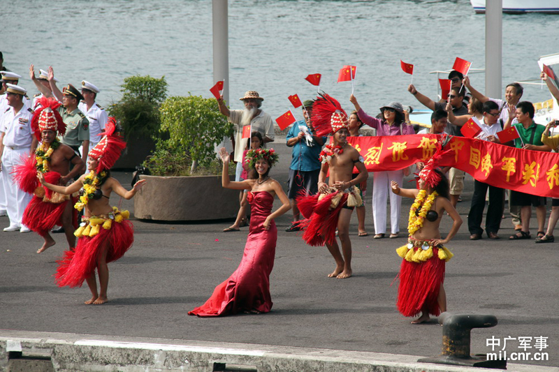 当地民众身着民族盛装载歌载舞欢送中国海军