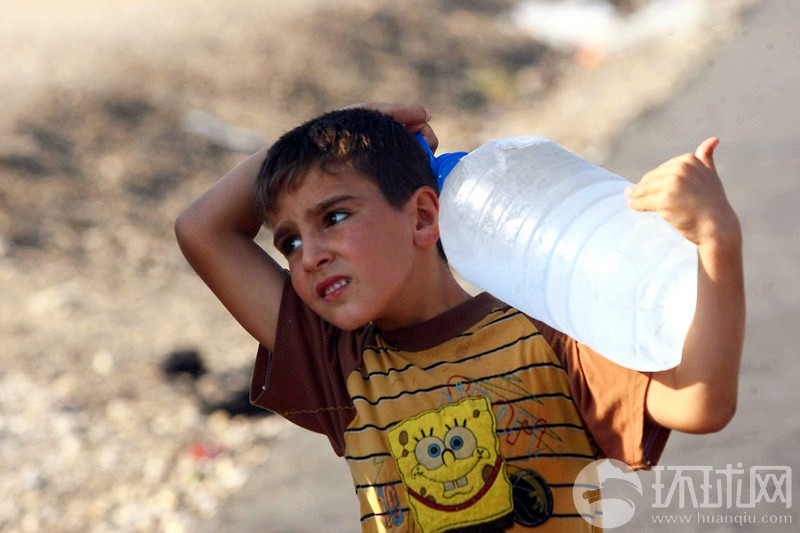 当地时间2012年7月22日,土耳其靠近叙利亚边境Kilis,一名难民儿童扛着水桶。