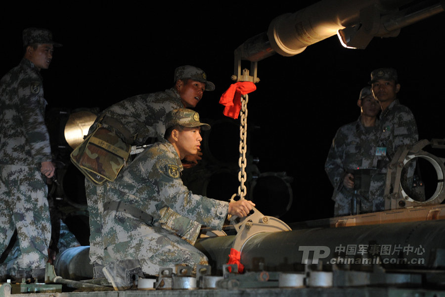 担负远火超远距离射击任务的官兵在夜间装填火箭弹。