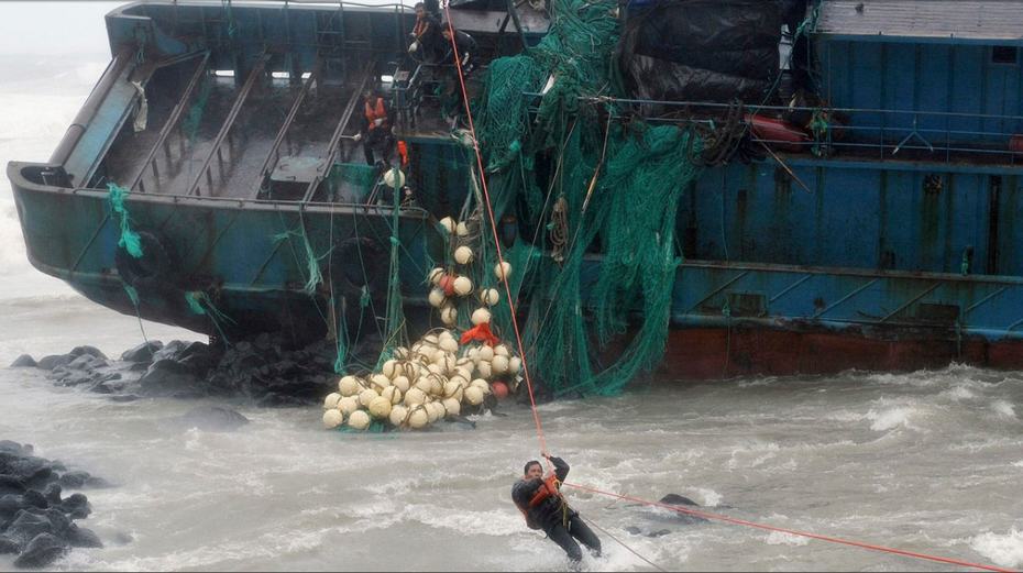 韩国海警救援队正在对搁浅的中国渔船实施营救