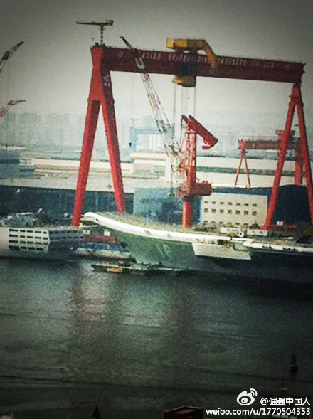 目前该航母的舰名仍然在猜测中,据悉,一些消息显示该舰将被命名为海军“辽宁”舰,但这些传言的可信度很低,仍无法被证实。图为刷漆过程。