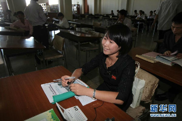 在朝鲜平壤的人民大学习堂内,人们在聚精会神地学习颇受欢迎的中文。