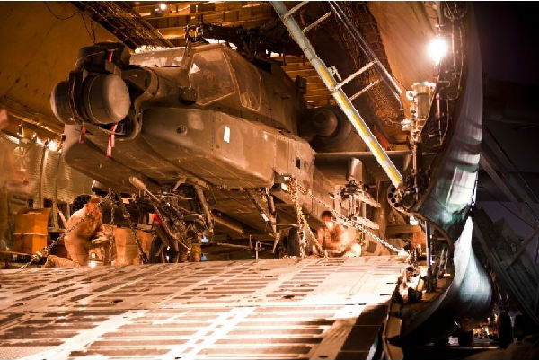 驻阿美军阿帕奇直升机装重型运输机撤离
