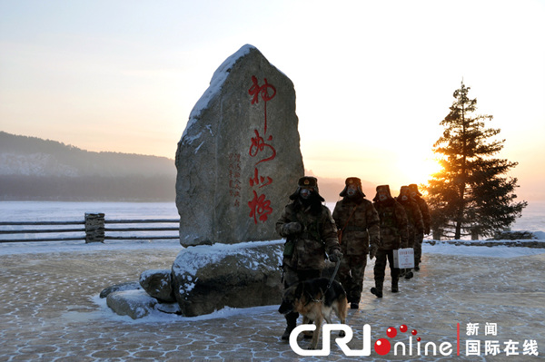 这里的冬季特别寒冷,气温最低能达到零下58度,边防战士们在巡逻站岗的时候,即使穿着厚厚的羊皮大衣和防寒靴,在室外待不到5分钟也照样被冻得透心凉。图为边防官兵们在界江巡逻执勤。