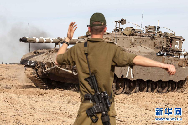 11月16日,在以色列南部靠近加沙地带边境某集结区域,一名以色列国防军士兵为坦克指路。以色列对加沙地带发动的“防务之柱”军事行动愈演愈烈,地面部队正在加沙地带边境集结。