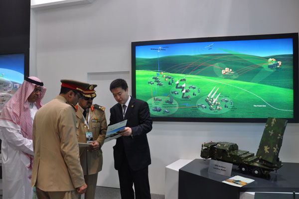 2月18日,中国保利科技有限公司的人员在第十一届阿布扎比国际防务展上介绍相控阵战场炮位侦察定位雷达。正在阿联酋阿布扎比举行的第11届国际防务会议暨展览会上,北方工业公司、保利科技有限公司、精密机械进出口总公司等中国军工企业自主研发高性能产品受当地关注。