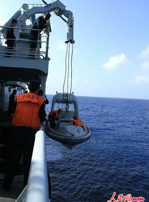 发现目标后,微山湖舰快速吊放高速救生小艇。