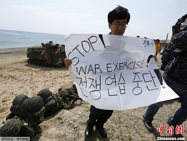 韩民众演练现场抗议美韩军演遭韩军阻拦