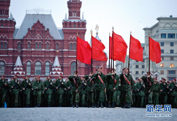 俄官兵为胜利日阅兵进行最后一次夜间彩排