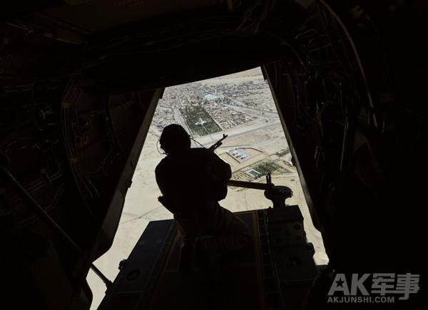 鱼鹰运输机内一名士兵瞄准地面,以防万一。