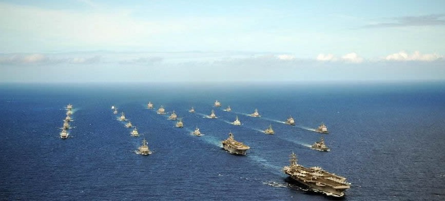 图为正在军演的美军舰队,注意其航母和两栖攻击舰的配置