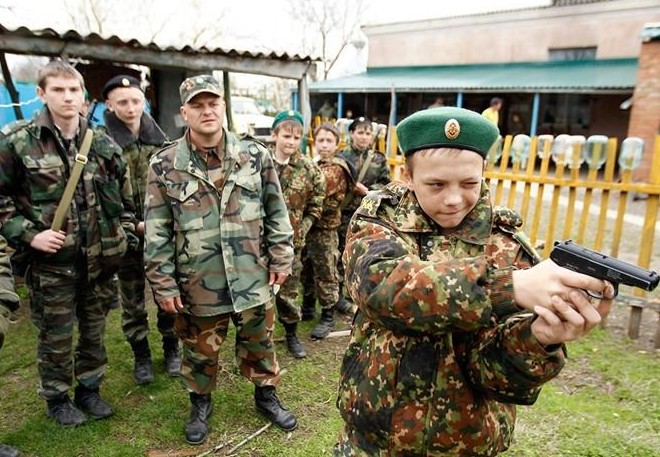 叶尔莫洛夫少年训练军校地处俄罗斯南部的斯塔夫罗波尔市,是一家国营机构。主要训练孩子们的军事知识和武器运用等技能。更加注重爱国主义教育。学校允许学生参加野外旅行训练,一般他们花一个晚上的时间在军事基地进行演习和武器训练。在俄罗斯,学习成绩差的孩子是不允许参加这次训练的。图为一个小男孩在学习如何操作手枪。