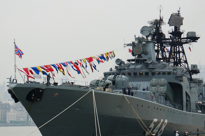 5月18日下午,参加中俄“海上联合——2014”军事演习的俄罗斯“潘捷列耶夫海军上将”号大型反潜舰(无畏级导弹驱逐舰)抵达上海吴淞军港码头。演习将于5月20日至26日在中国东海北部海空域举行,双方都派出了主战舰艇、飞机及舰载直升机、特战分队等装备、兵力参演。