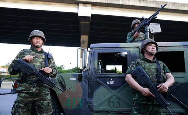 泰军街头持枪戒严 士兵悠闲美女争相合影