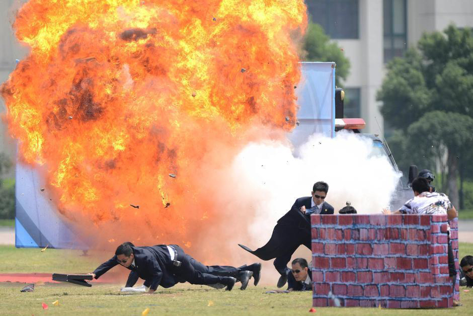 5月27日,浙江省绍兴市,浙江省公安厅集结了11个地市的特警,举行了一场代号为“特警3号”的反恐维稳汇报演练。来自浙江省各地市千余名公安特警、武警、海警、警卫部队和消防等反恐一线的队伍进行了暴力恐怖事件实战处置、武警反恐特战演练、高精度狙击步枪射击和群体性事件处置等9个科目的演练。图为群体事件性
