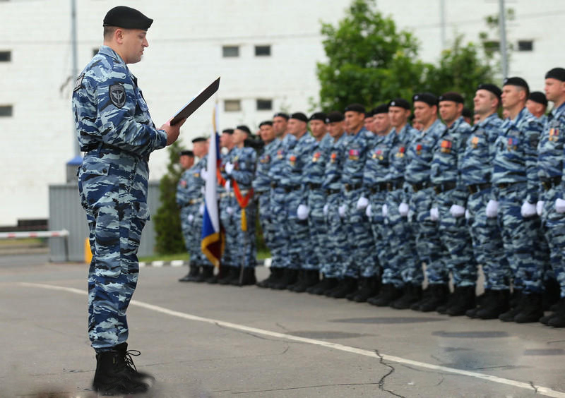 当地时间2014年5月30日,俄罗斯莫斯科,前乌克兰“别尔库特(也就是所谓的“金雕”特种部队)”防暴警察参加宣誓仪式,他们将效忠于俄罗斯联邦内务部。俄罗斯联邦内务部部长科洛科利采夫出席宣誓仪式。