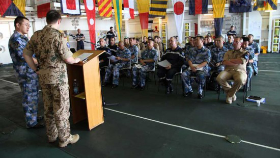 当地时间3月19日上午9时,中国海军第十六批护航编队指挥员李鹏程大校一行15人,登上欧盟465编队指挥舰法国海军“西罗科风”号船坞登陆舰,就中欧反海盗联合演练有关细节进行战术磋商。