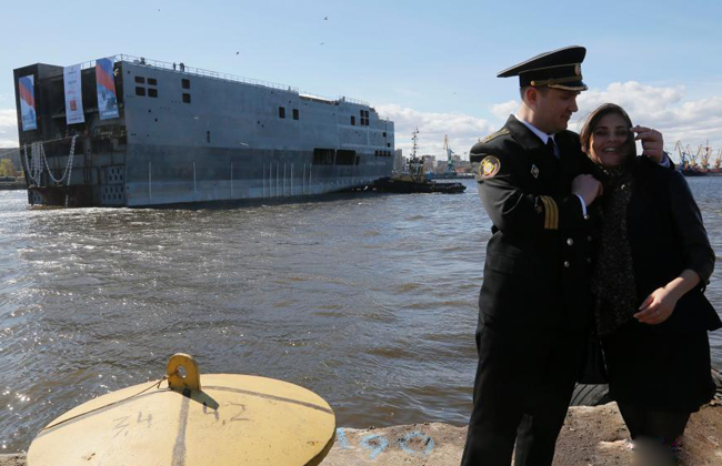 当地时间4月30日,俄罗斯圣彼得堡,“西北风”级两栖舰“塞瓦斯托波尔”号的船尾下水。该船尾将被托运至法国完成组装。俄罗斯购买法国“西北风”级两栖攻击舰是一战以来俄罗斯与西方国家之间最大的军舰采购交易。