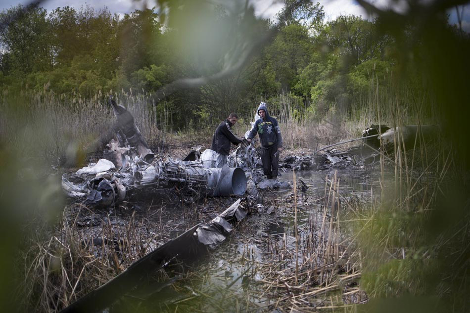 当地时间2014年5月6日,乌克兰Raigorodok,乌克兰军方直升机被击落,当地居民捡直升机零部件。该飞机原本是接受命令于周一,紧急迫降自在局势紧张的斯拉维扬斯克,结果被乌克兰军方击落,目的是不让其落入叛乱部队手中。