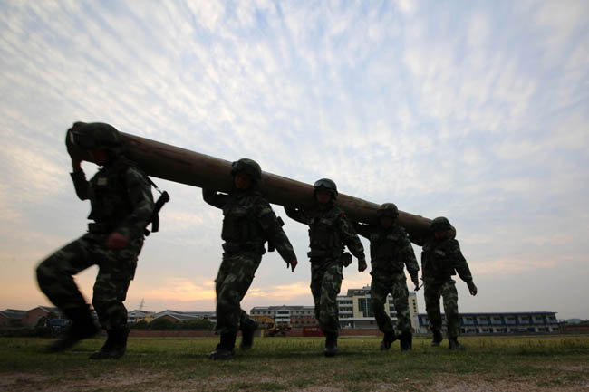 5月8日,武警浙江总队反恐特战队员在进行高强度体能训练。