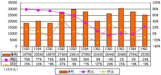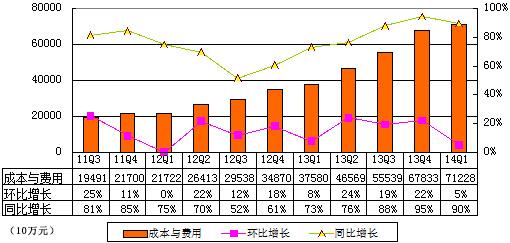 截至2014年3月31日,百度持有的现金、现金等价物和短期投资总值为396.79亿元(约合63.83亿美元)。百度第一季度净运营现金流和资本支出分别为36.12亿元(约合5.811亿美元)和10.43亿元(约合1.678亿美元)。