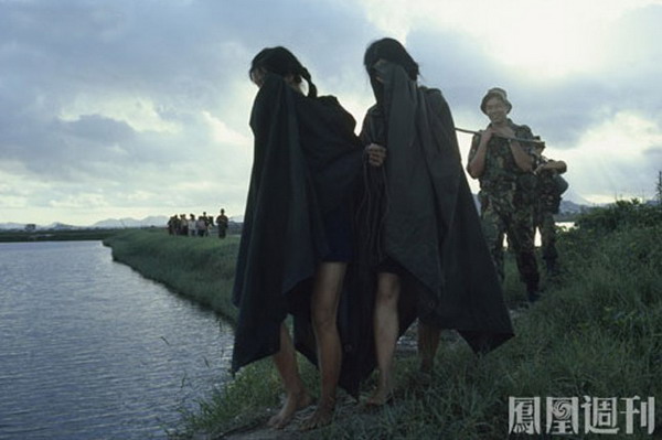 1979年5月6日,在广东深圳的边防前哨,突然聚集起近7万名来自广东各地的民众,形成数十条凶猛的洪流扑向边境线,边防军人束手无策,向天鸣枪示警也没用,几个哨位一下子被争先恐后非法越境的人流吞噬。图为驻港英军廓尔喀步兵旅的士兵押送逃港者前往遣返地