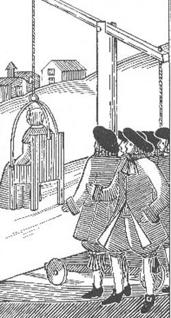 木靴子:受刑者的腿被置于两块厚木板之间再用绳子束紧。拷问者在绳子间用锤子猛烈地向下打入楔子。每打入一次楔子,楔尖部位的胫骨就被粉碎。该刑罚至少要在腿的上下两侧打入12根楔子。当木靴子拆除后,骨头碎片就像装在一条松垮的袋子里一般。