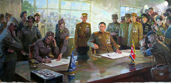 《朝鲜停战协定》全称《朝鲜人民军最高司令官及中国人民志愿军司令员一方与联合国军总司令另一方关于朝鲜军事停战的协定》。图为朝鲜宣传画中的停战协定签订现场,宣传画展现了朝鲜人民军与中国人民志愿军代表团首席代表朝鲜人民军大将南日与联合国军代表团首席代表美国陆军中将威廉·凯·哈利逊在板门店签署朝鲜停战协定的场面,但画面中并没有出现一个中国人。在朝鲜的教科书中,并未提到中国人民志愿军,请点击详细,浏览《朝鲜中学教材中有关“6·25战争”(朝鲜战争)的主要内容》全文(文字来源:《文史参考》2010年第12期,原题:历史教科书中的朝鲜战争)。